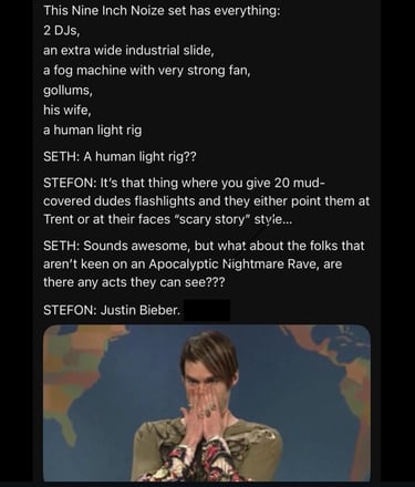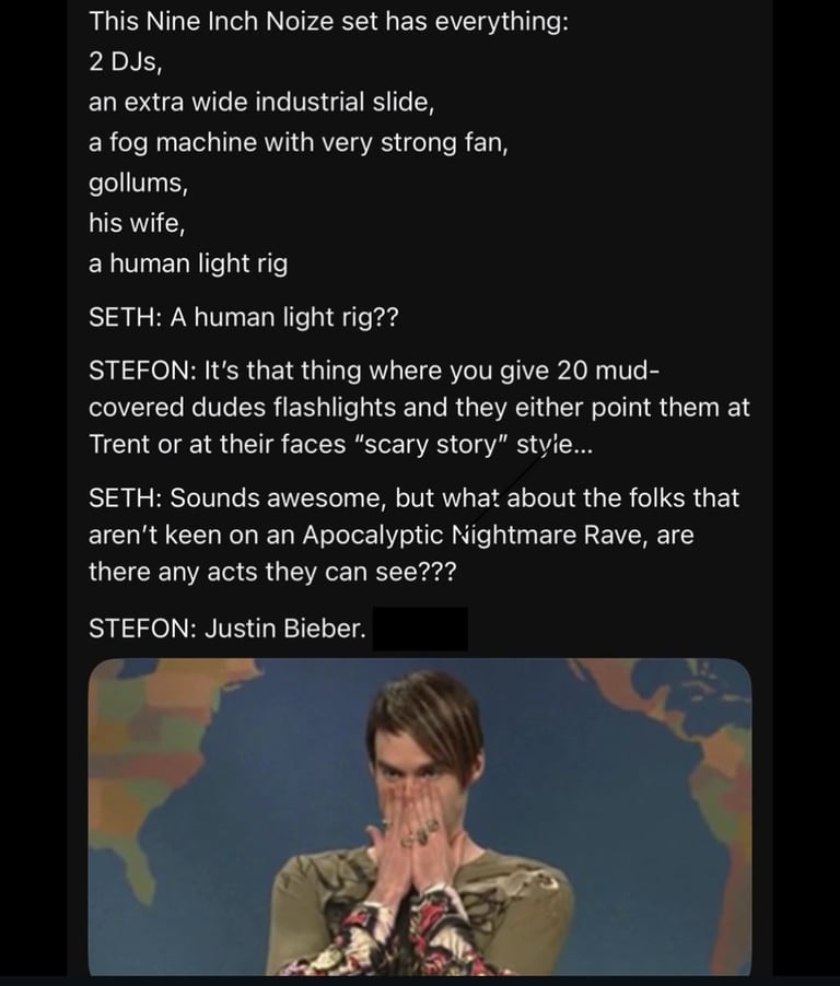 NINE INCH NOIZE: Really great and impressive performance, especially considering that Trent Reznor is 60. It was a cool experience to hear alternate versions of songs that have been so ubiquitous throughout my life. I go back to the Boys Noize version of the Challengers soundtrack every few months so it was fun to see them perform together. The visuals were cool and impressive but this is a little too accurate: